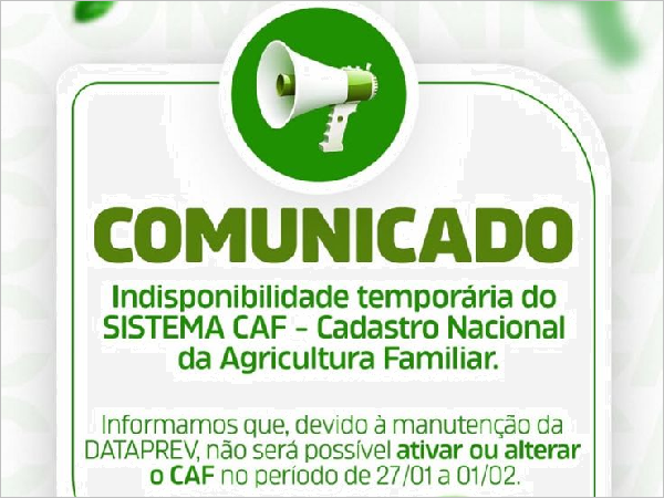 A Prefeitura de Cascavel, por meio da Secretaria de Agricultura, Pesca e Defesa Civil, comunicou a indisponibilidade temporária do Sistema CAF